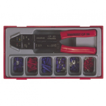 Комплект Teng Tools , състоящ се от кримпващи клещи CP50 за кримпване на червени, сини и жълти клеми ...