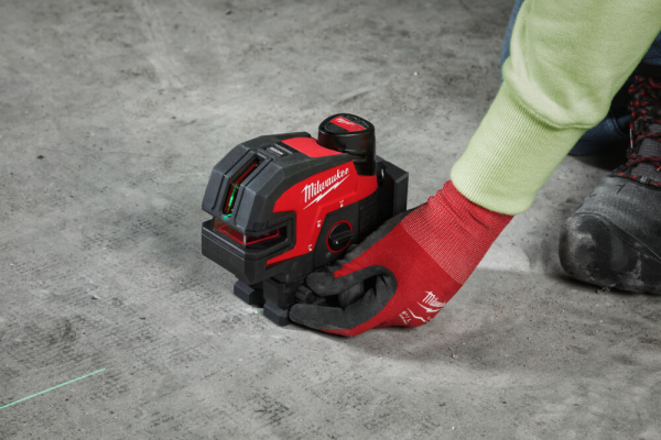M12™ green cross line laser with 4 points, provides an all-in-one functionality with horizontal levelling, vertical alignment, plumb point transfer from floor to ceiling and horizontal point transfer.